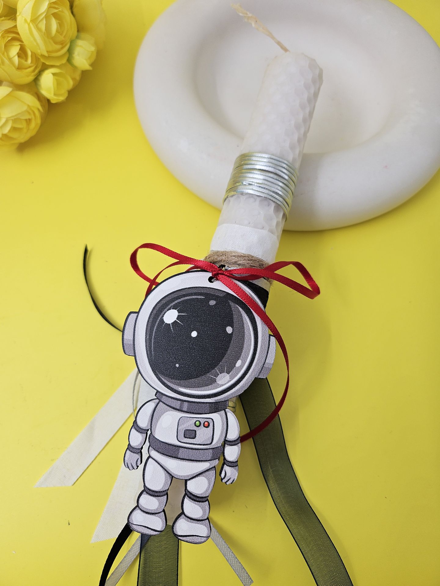 Η λαμπάδα από μελισσοκέρι, χειροποίητη με ένα ελαφρύ άρωμα σε λευκό χρώμα στολισμένο με κορδέλες και ξύλινο στοιχείο μπρελόκ ενός μικρού αστροναύτη. Περιλαμβάνεται και κουτί.