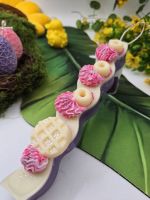 Λαμπάδα σόγιας ή ελαιοκράμβης 100% χειροποίητη σε χρώμα Μπεζ-Μωβ με δίχρωμη σαντιγί με λευκά στοιχεία που την κάνει ακόμα πιο λαχταριστή και έρχεται στο άρωμα Ζαχαρωτών. Περιλαμβάνεται και κουτί.