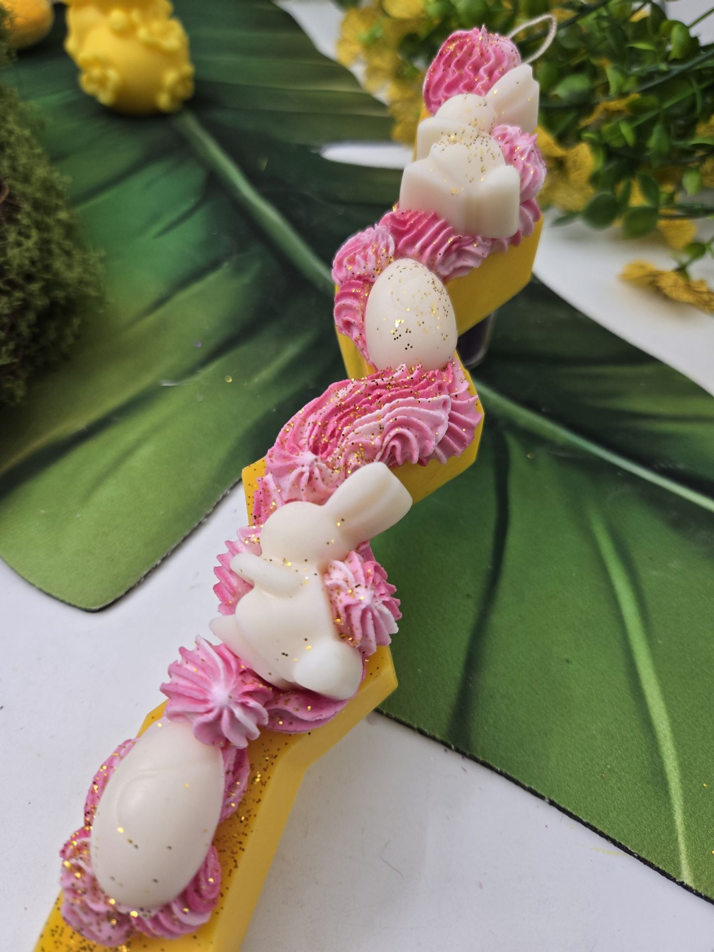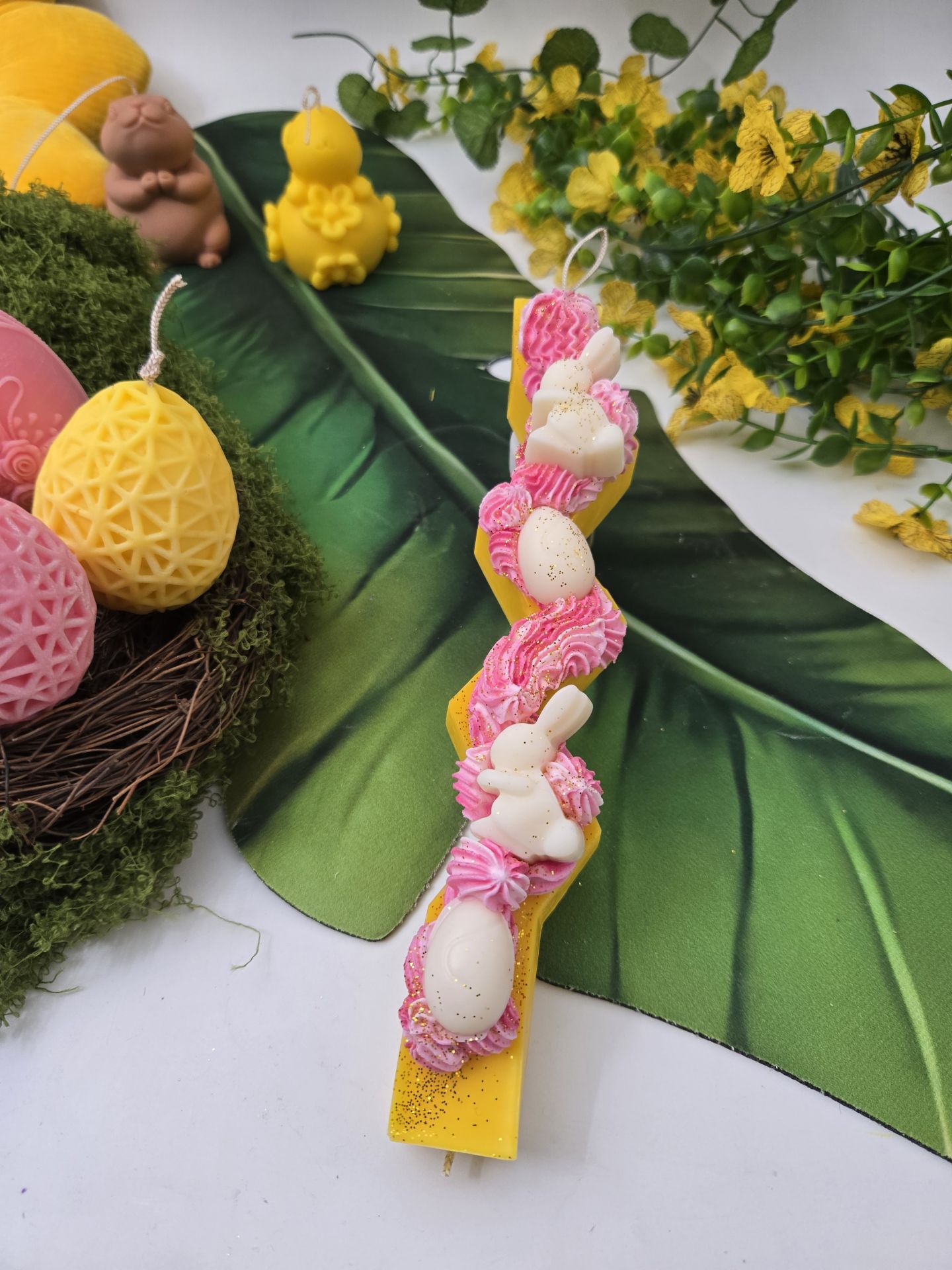 Λαμπάδα σόγιας ή ελαιοκράμβης 100% χειροποίητη σε χρώμα Κίτρινο με δίχρωμη σαντιγί και λευκά στοιχεία που την κάνει ακόμα πιο λαχταριστή και έρχεται στο άρωμα Βανίλια- Μαστίχα. Περιλαμβάνεται και κουτί.