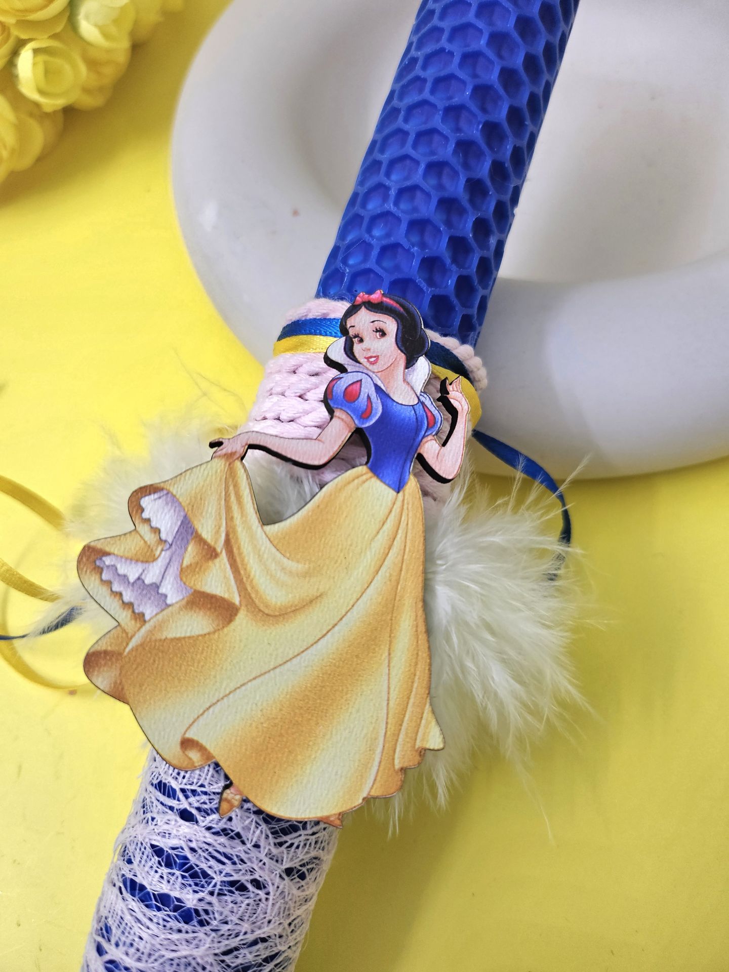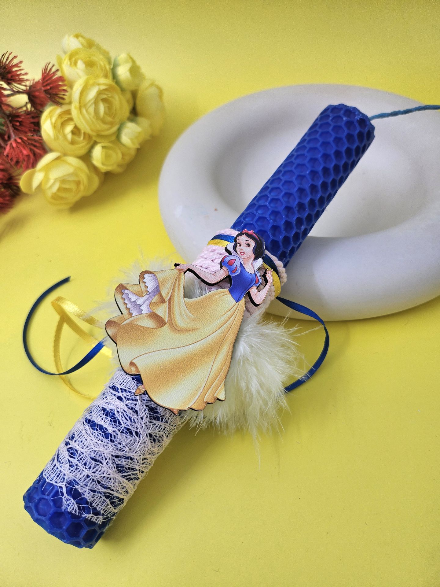 Είναι φτιαγμένες από μελισσοκέρι, χειροποίητες με ένα ελαφρύ άρωμα σε μπλε χρώμα. Η λαμπάδα είναι διακοσμημένη με κορδέλες και ξύλινο στοιχείο της Χιονάτης. Περιλαμβάνεται και κουτί.