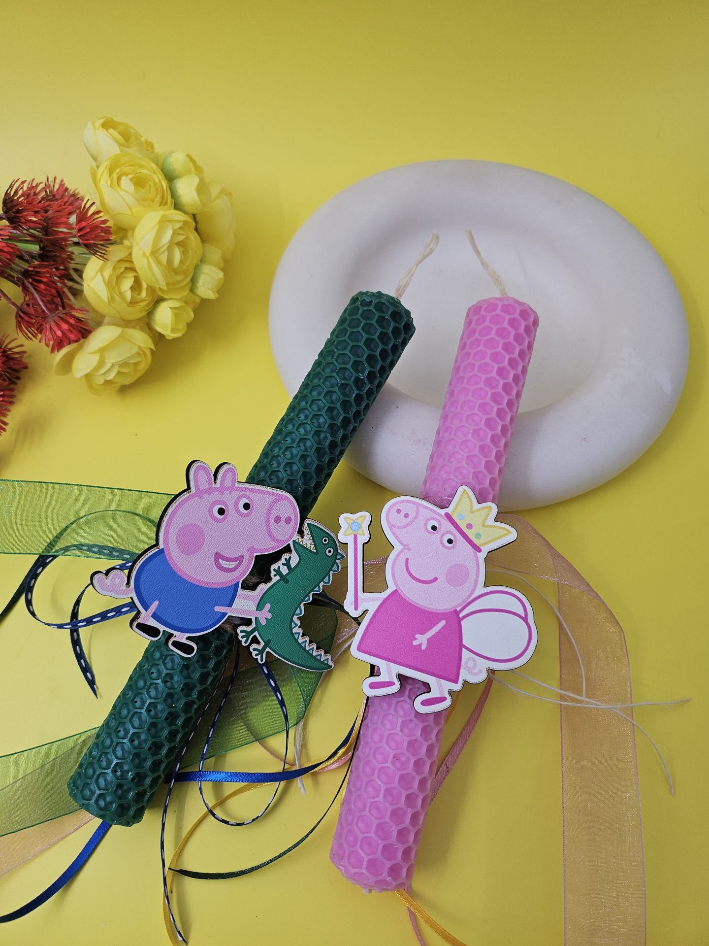 Η λαμπάδα από μελισσοκέρι, χειροποίητη με ένα ελαφρύ άρωμα σε πράσινο χρώμα στολισμένο με κορδέλες και ξύλινο στοιχείο George το γουρουνάκι, από την γνωστή παιδική σειρά Πέππα. Περιλαμβάνεται και κουτί.