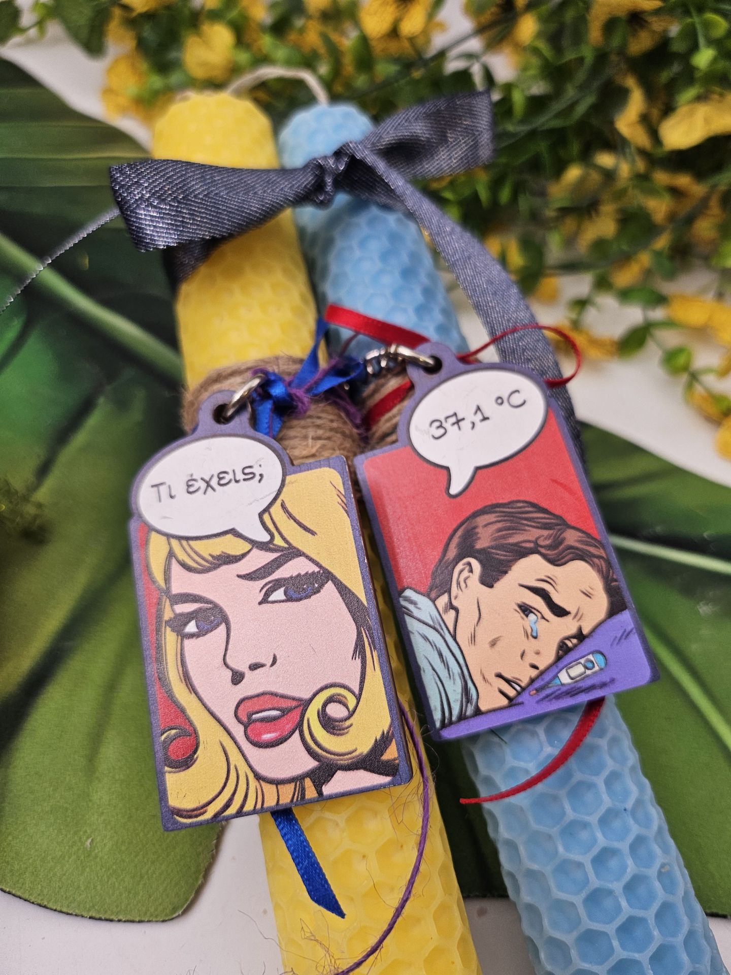 Αν θες εσύ και το ταίρι σου να πάτε στην ανάσταση με χιούμορ και στιλ τότε αυτές οι λαμπάδες είναι για εσάς. Είναι φτιαγμένες από 100% μελισσοκέρι, χειροποίητη με ένα ελαφρύ άρωμα, σε χρώμα Γαλάζιο και Κίτρινο και 2 μπρελόκ "Τι Έχεις;", "37,1°C" για να τα έχετε matchy matchy μετά την ανάσταση. Περιλαμβάνεται και κουτί. Οι λαμπάδες είναι σετ.