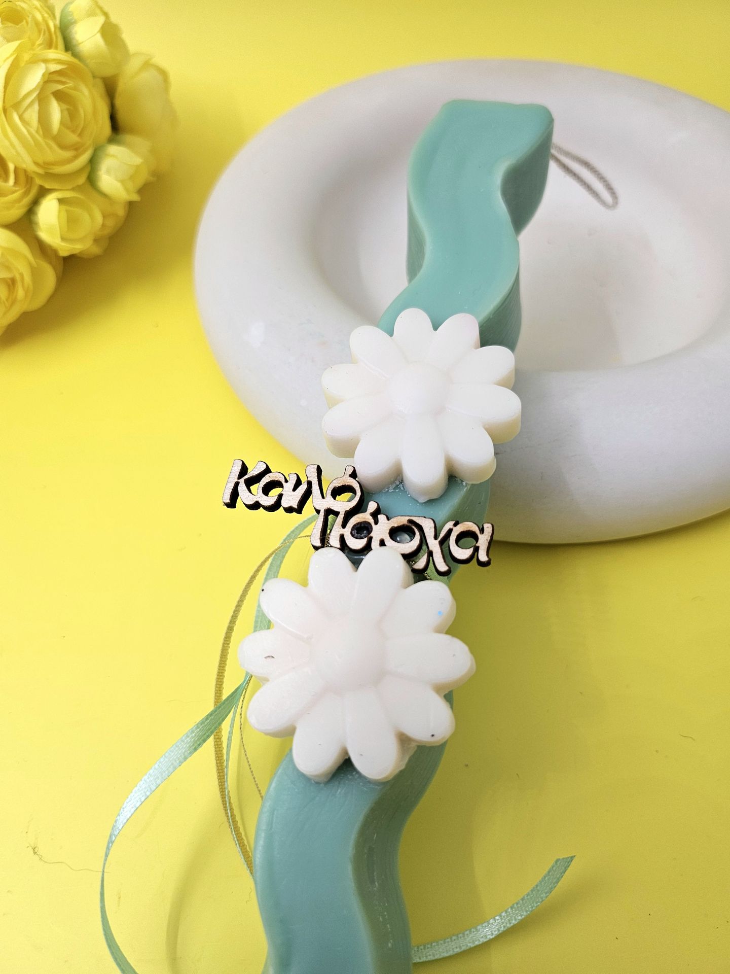 Λαμπάδα σόγιας ή ελαιοκράμβης 100% χειροποίητη σε μεντέ χρώμα, διακοσμημένη με κορδέλες, ξύλινο στοιχείο "Καλό Πάσχα" και κέρινα λουλούδια και άρωμα Fresh Breeze.
