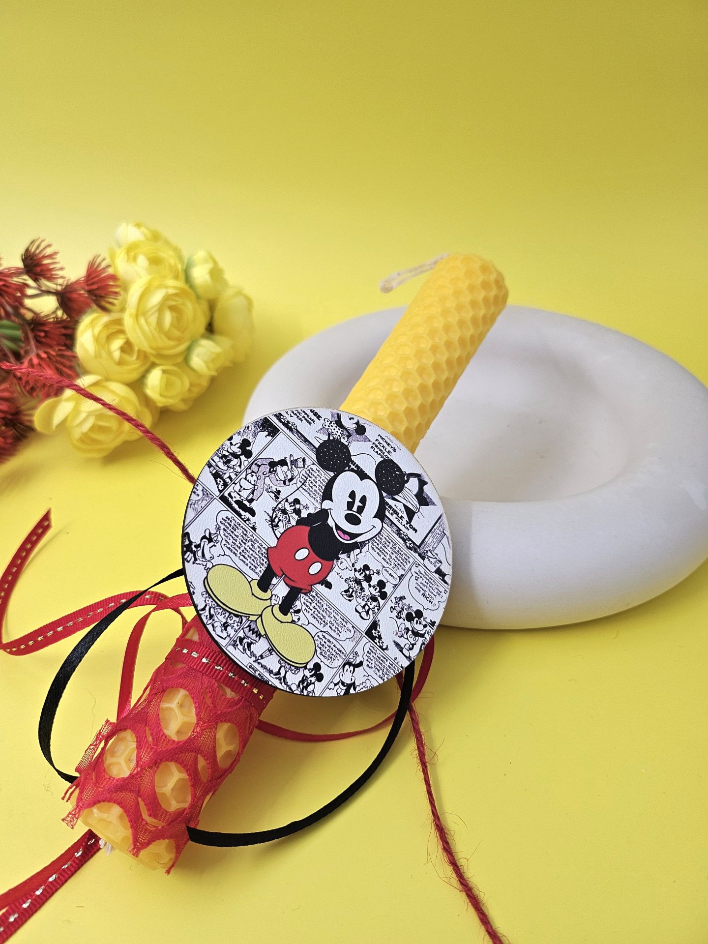 Η λαμπάδα από 100% μελισσοκέρι, χειροποίητη με ένα ελαφρύ άρωμα σε Κίτρινο χρώμα στολισμένο με κορδέλες και ξύλινο στοιχείο Mickey Mouse. Περιλαμβάνεται και κουτί.