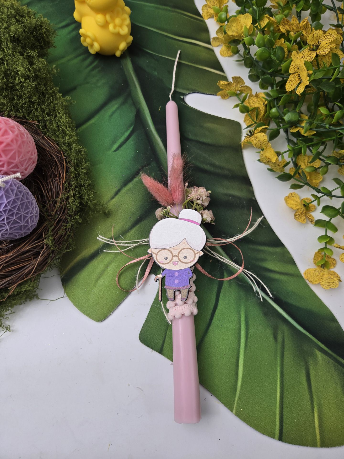 Λαμπάδα σόγιας ή ελαιοκράμβης 100% χειροποίητη σε ροζ χρώμα την γιαγιά σε άρωμα γαρδένια και λευκό τον παππού σε άρωμα γιασεμί, στολισμένες με ξύλινο στοιχείο και κορδέλες. Περιλαμβάνεται και κουτί. Διάλεξε το αγαπημένο σου σχέδιο για το πιο αγαπημένο σου πρόσωπο.