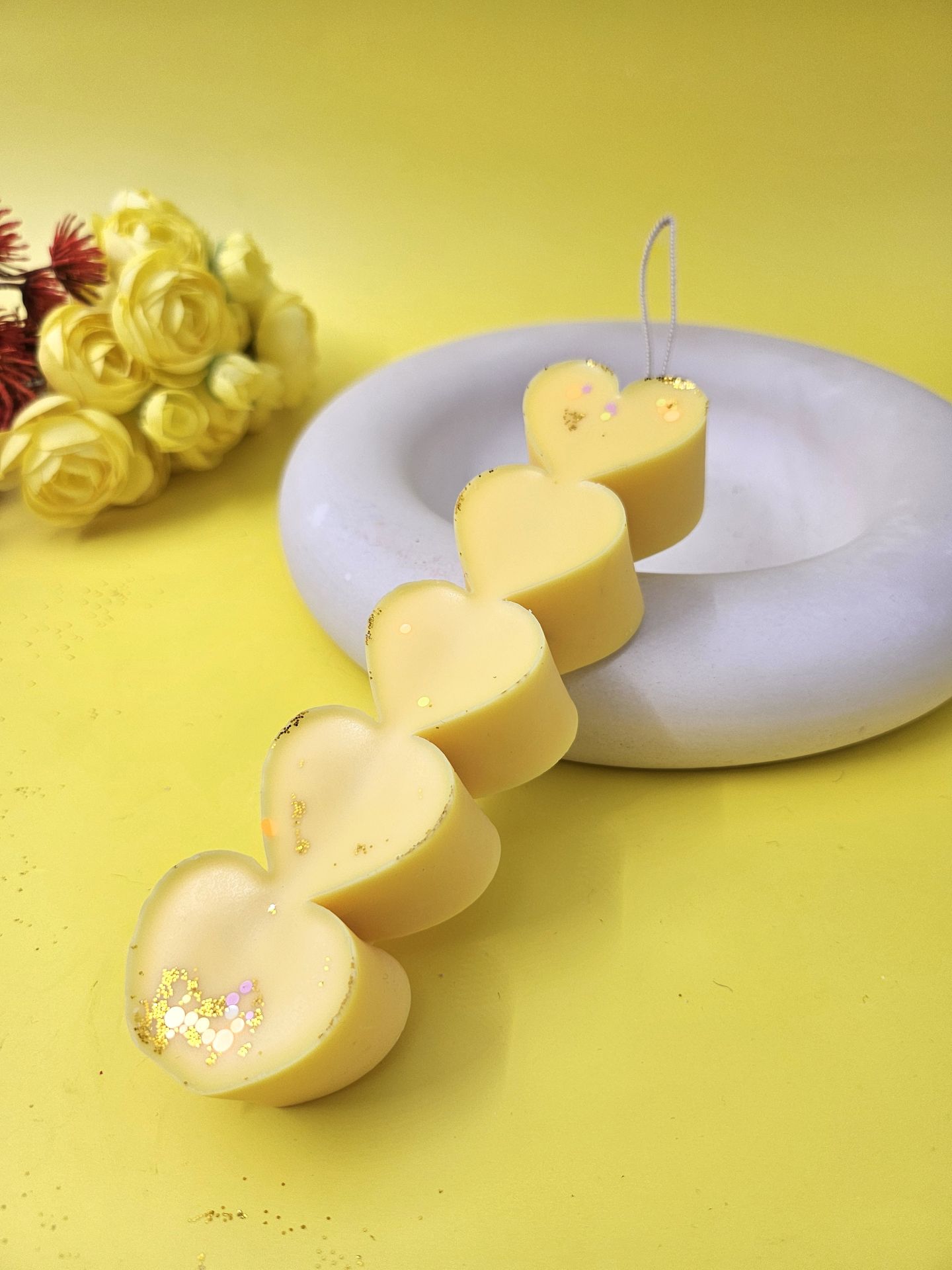 Λαμπάδα καρδιές από σόγιας ή ελαιοκράμβης 100% χειροποίητη σε χρώμα Κίτρινο και άρωμα Άνθος Λεμονιού. Περιλαμβάνεται και κουτί.